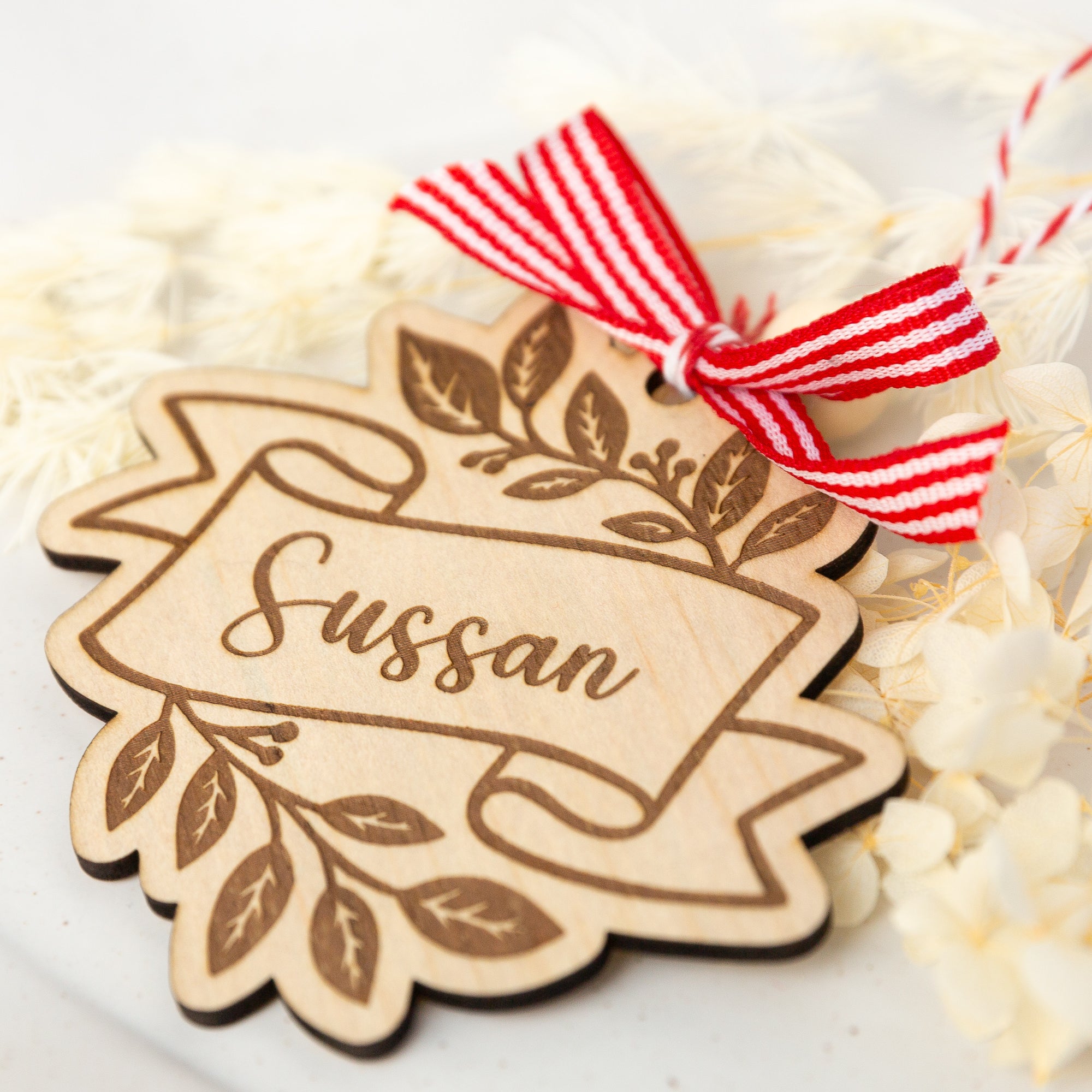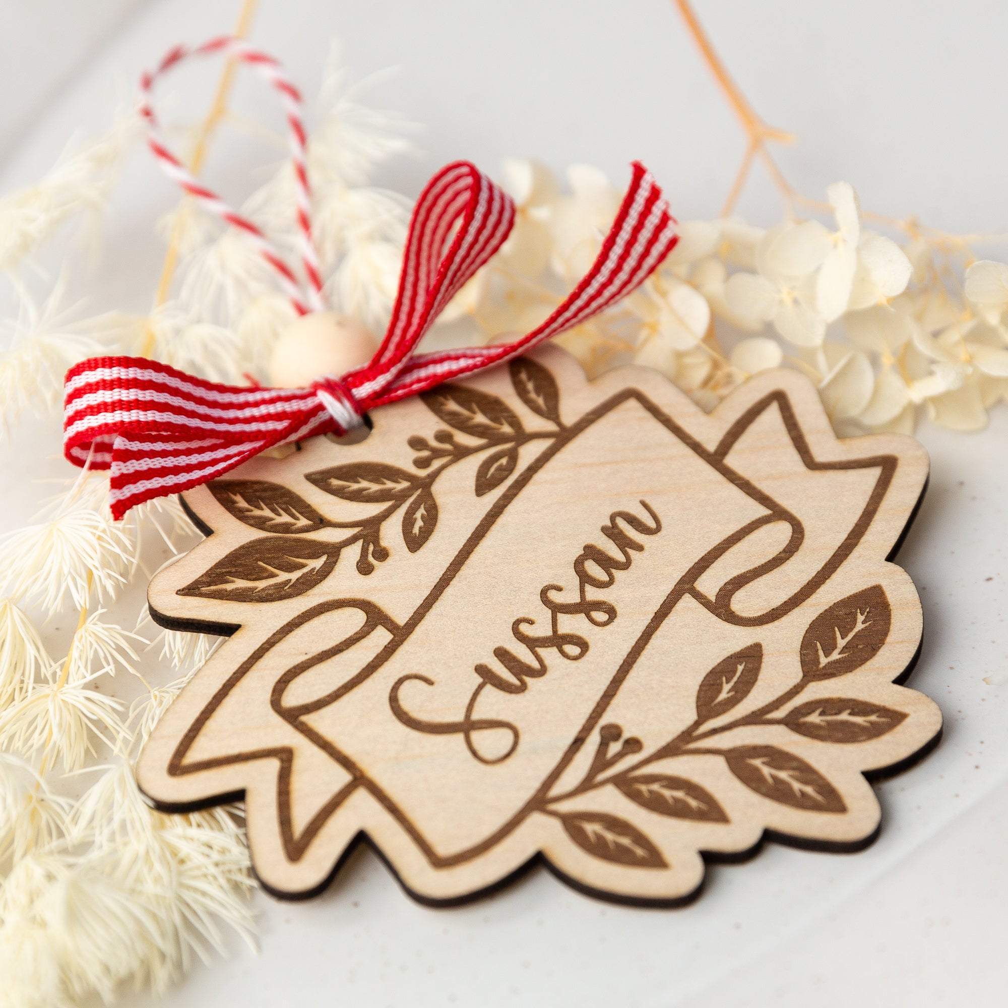 Add a touch of classic Christmas charm to your tree with this beautifully engraved holly ornament. Each piece is laser-engraved with your chosen name inside a flowing banner, surrounded by delicate holly and leaf detailing. Finished with a festive red-and-white ribbon and natural wooden bead, it’s the perfect keepsake for gifting or decorating your own home.